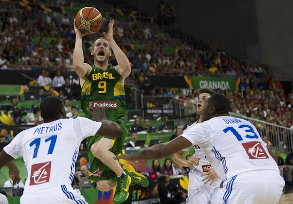 Brazil's Marcelinho Huertas, center, shoots over France's Florent Pietrus, left, and Boris Diaw, right, during the Group A Basketball World Cup match between Brazil and France in Granada, SpainDANIEL TEJEDOR/The Associated Press