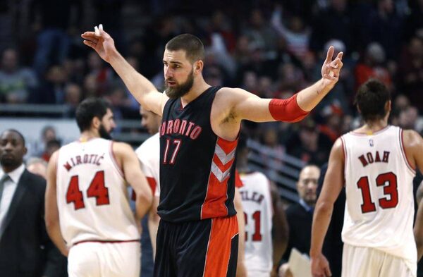 Toronto Raptors center Jonas Valanciunas (17) reacts after being called for a foul during the second half of an NBA basketball game against the Chicago Bulls on Monday, Dec. 22, 2014, in Chicago. The Bulls won 129-120.Charles Rex Arbogast/The Associated Press