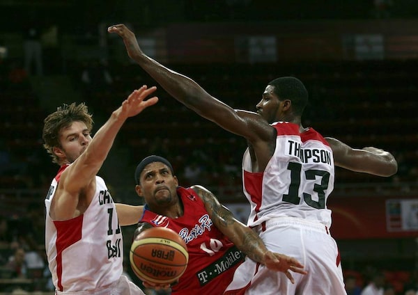 Puerto Rico's Elias Ayuso, center, drives past Canada's Aaron Doornekamp, left, and Tristan Thompson, to shoot during a FIBA World Cup qualifying basketball game in Caracas, Venezuela, Saturday, Aug. 31, 2013. Puerto Rico defeated Canada 83-67.Juan Carlos Solorzano/The Associated Press
