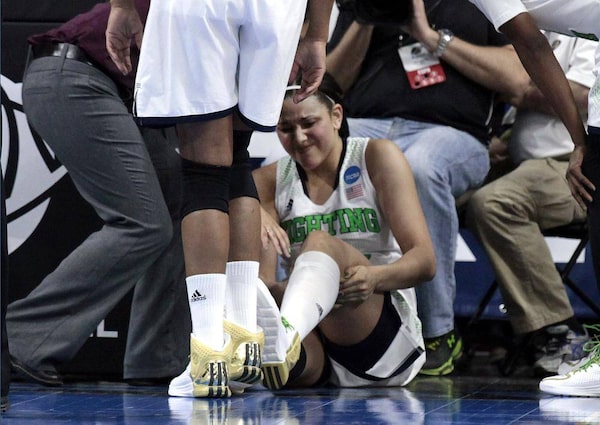 Notre Dame forward Natalie Achonwa is tended to by a trainer in the second half of their NCAA women's college basketball tournament regional final game against Baylor at the Purcell Pavilion in South Bend, Ind., Monday, March 31, 2014. Achonwa left the game with the injury.Paul Sancya/The Associated Press