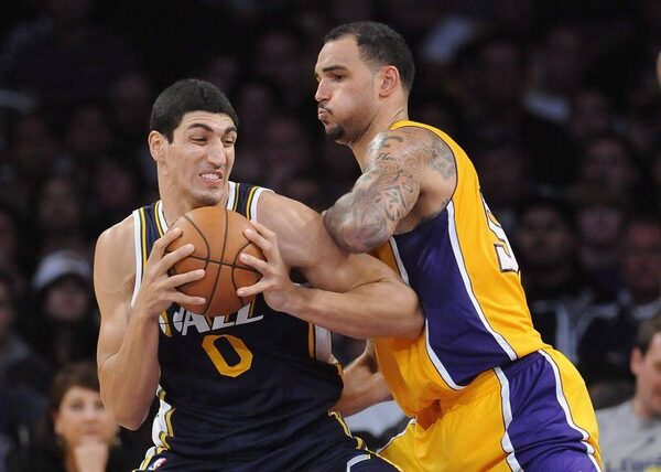 Utah Jazz center Enes Kanter (0), of Turkey, battles Los Angeles Lakers Canadian center Robert Sacre, right in the second half of an NBA preseason basketball game, Saturday, Oct. 13, 2012, in Los Angeles. Sacre, a 23-year-old seven-footer from North Vancouver, B.C., was not selected in the first round last June. In fact, he was the last pick (60th overall) in the two-round NBA draft.Gus Ruelas/The Associated Press