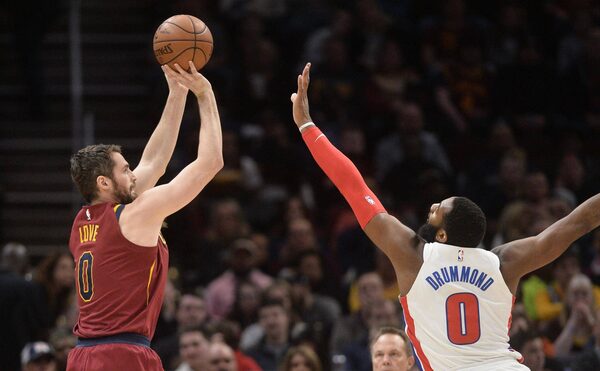 Cleveland Cavaliers forward Kevin Love (0) shoots over the defense of Detroit Pistons center Andre Drummond (0) during the first quarter at Quicken Loans Arena, Jan. 28, 2018.Ken Blaze
