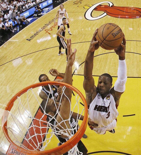 Miami Heat's Dwayne Wade dunks against San Antonio Spurs forward Tim Duncan during Game 6 of the NBA Finals on June 18, 2013. Wade is under contract for the 2015-16 season, and would earn about $16.1 million. He also could opt out and become a free agent.Kevin C. Cox/The Associated Press