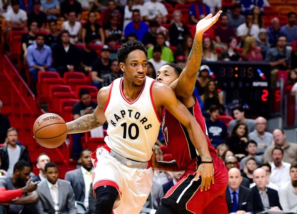 Toronto Raptors guard DeMar DeRozan is guarded by Miami Heat’s Rodney McGruder in Miami on March 11, 2017.Steve Mitchell