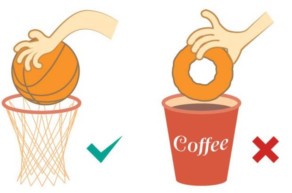 - Dunking a basketball is similar to dunking a honey cruller, except you let go of the basketball. The rim does not roll up.