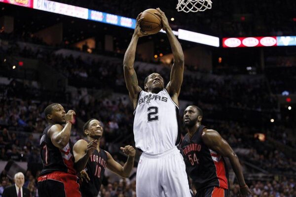 San Antonio Spurs small forward Kawhi Leonard (2) dunks the ball during the first half against the Toronto Raptors at AT&T Center.Soobum Im