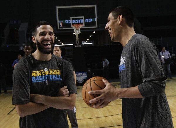 Orlando Magic centre Gustavo Ayon (L) speaks with New Orleans Hornets guard Greivis Vasquez after organizing a clinic for disabled children during a NBA Cares outreach event in Mexico City October 6, 2012. As the world's top professional basketball league gears up for Sunday's preseason launch in Mexico City, National Basketball Association officials are hinting at permanent expansion south of the border. The Magic will play an exhibition game against the Hornets on October 7 in Mexico City.HENRY ROMERO/Reuters