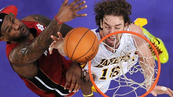 Miami Heat forward LeBron James, left, and Los Angeles Lakers power forward Pau Gasol of Spain reach for a rebound during the first half of their NBA basketball game, Saturday, Dec. 25, 2010, in Los Angeles. The Heat won 96-80. (AP Photo/Mark J. Terrill)Mark J. Terrill/The Associated Press