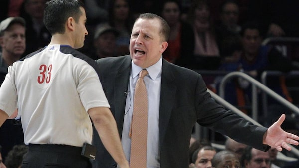 Chicago Bulls head coach Tom Thibodeau complains to referee Sean Corbin (33) in the second half of the Bulls 103-95 loss to the New York Knicks. (AP Photo/Kathy Willens)Kathy Willens/The Associated Press