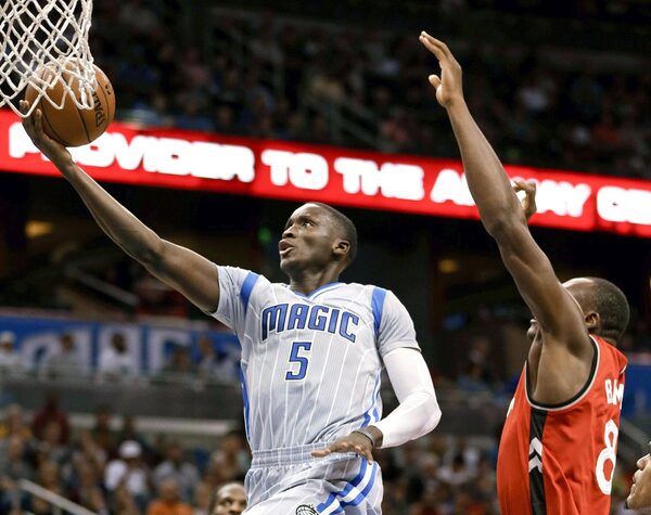 Orlando Magic guard Victor Oladipo (5) drives to the basket for a shot past Toronto Raptors forward Bismack Biyombo (8) during the second half of an NBA basketball game Friday, Nov. 6, 2015, in Orlando, Fla. Orlando won 92-87.John Raoux/The Associated Press