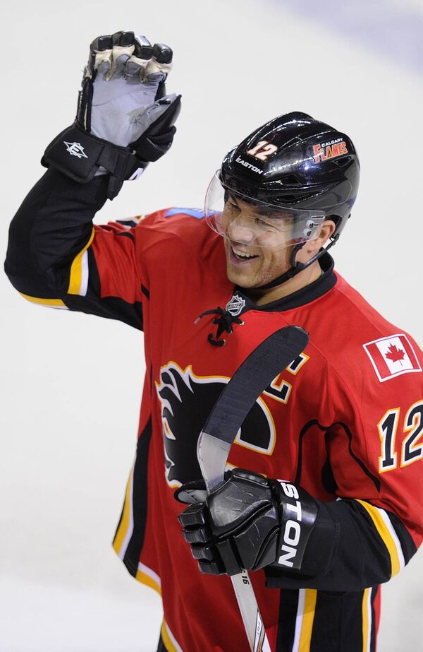 Calgary Flames' Jarome Iginla celebrates his 500th goal during the third period of their NHL hockey game against the Minnesota Wild in Calgary, Alberta, January 7, 2012.