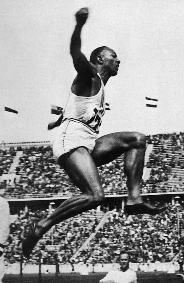 US champion "Jesse" (James Cleveland) Owens is airborne during the long jump event, that he won, 09 August 1936 during Olympic Games in Berlin. Grandson of a slave and legendary athlete, "Jesse" Owens established 6 world records in 1935. Jesse Owens retained his 100m world record for 20 years and his long jump world record for 25 years.AFP / Getty Images