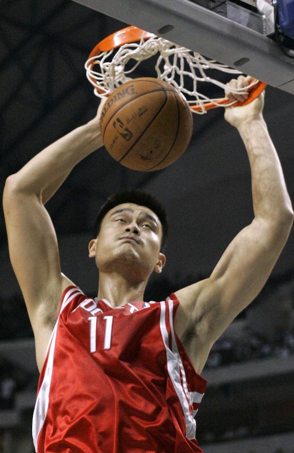 Houston Rockets center Yao Ming, from China, scores against the Dallas Mavericks in the first half of their NBA basketball game in Dallas, Thursday, Oct. 30, 2008.