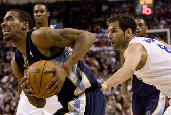 Memphis Grizzlies O.J. Mayo, left, drives past the Toronto Raptors' Jose Calderon during first half NBA action in Toronto on Wednesday February 17, 2010. THE CANADIAN PRESS/Chris YoungCHRIS YOUNG/The Canadian Press