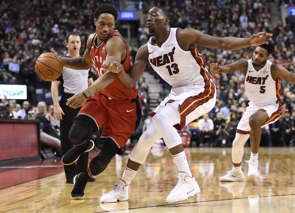 Toronto Raptors guard DeMar DeRozan drives past Miami Heat centre Bam Adebayo during their game on Jan. 9, 2018.Nathan Denette/The Canadian Press