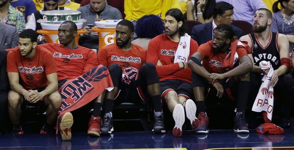 Toronto Raptors' Cory Joseph, Bismack Biyombo, Patrick Patterson, Luis Scola, DeMarre Carroll and Jonas Valanciunas, fromleft, sit on the bench during the second half of Game 5 of the NBA Eastern Conference Finals.Tony Dejak/The Associated Press
