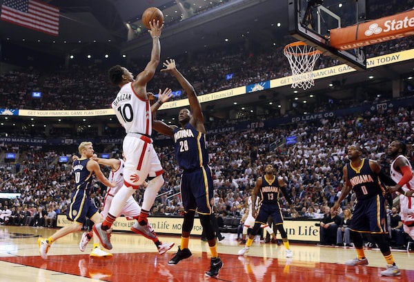 DeMar DeRozan (10) of the Toronto Raptors shoots the ball as Ian Mahinmi (28) of the Indiana Pacers defends during the NBA season opener at Air Canada Centre on October 28, 2015 in Toronto, Ontario, Canada.Vaughn Ridley/Getty Images