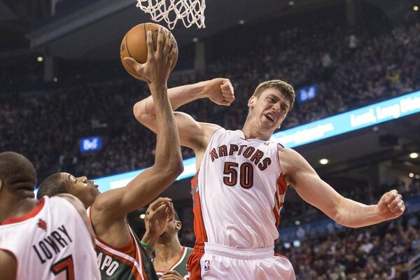 Toronto Raptors' Tyler Hansbrough (right) celebrates scoring on a rebound in front of Milwaukee Bucks' Giannis Antetokounmpo (centre) during first half NBA basketball action in Toronto on Monday, April 14, 2014.Chris Young/The Canadian Press