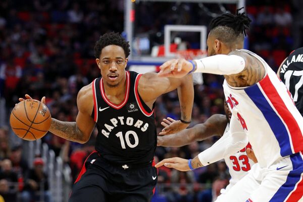 Toronto Raptors guard DeMar DeRozan dribbles by Detroit Pistons forward Eric Moreland in the first half at Little Caesars Arena in Detroit, on March 7, 2018.Rick Osentoski