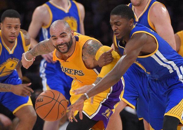 Los Angeles Lakers forward Carlos Boozer and Golden State Warriors guard Justin Holiday battle for a loose ballMark J. Terrill/The Associated Press