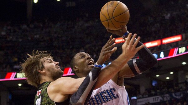 The Toronto Raptors' Aaron Gray fouls the Orlando Magic's Dwight Howard in Toronto on Monday.Chris Young/The Canadian Press