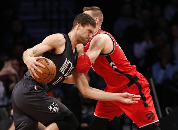 Brooklyn Nets center Brook Lopez (11) runs into resistance from Toronto Raptors centre Jonas Valanciunas during the first half on Feb. 5, 2017, in New York.Kathy Willens/The Associated Press