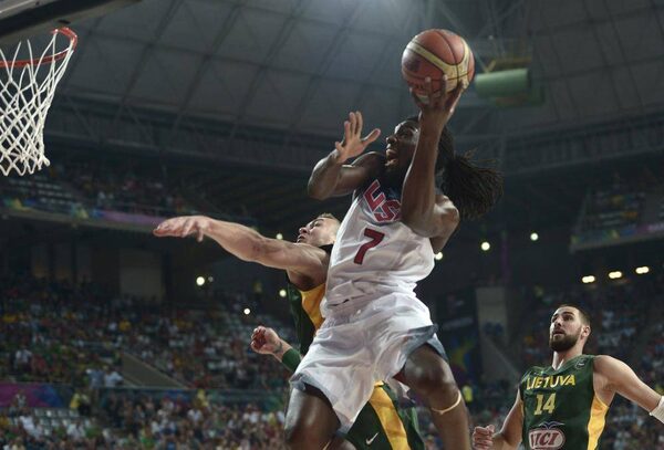 Renaldas Seibutis made two free throws — Lithuania wouldn't made a field goal for the first 4:43 of the period — before the U.S. speedsters raced to eight more points, with Anthony Davis slamming down a lob from Kyrie Irving to make it 61-37.