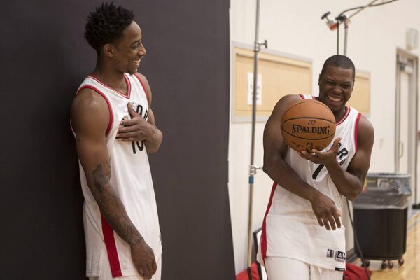 Toronto Raptors' DeMar DeRozan (left) and Kyle Lowry share a joke.Chris Young/The Canadian Press
