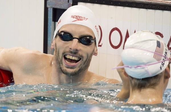 Canadian swimmer Ryan Cochrane laughs as he chats with USA swimmer Missy Franklin in the pool while training at the 2016 Summer Olympics on August 4, 2016 in Rio de Janeiro, Brazil.Frank Gunn/The Canadian Press