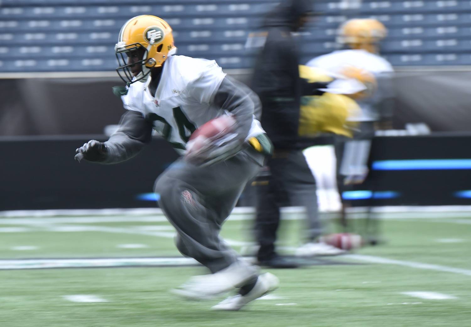Edmonton Eskimos Akeem Shavers runs with the ball during the team's practice.Nathan Denette/The Canadian Press