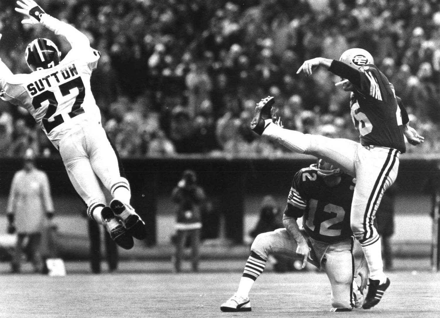 Edmonton Eskimos kicker Dave Cutler boots the game-winning field goal as Ottawa Rough Riders Jon Sutton tries to block during the dying seconds of the 1981 Grey Cup in Montreal.Ron Poling/The Canadian Press
