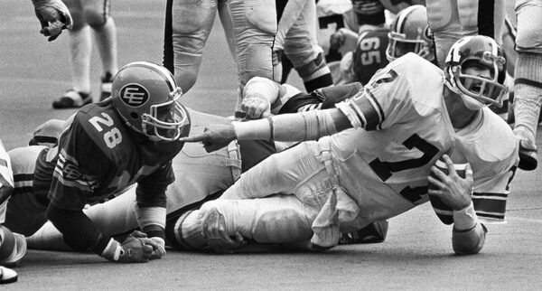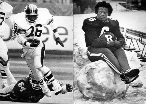 Ottawa running back, Sam Platt, jumps over Edmonton defender, Dave Boone, left, in 1981 Grey Cup game. Ottawa Rough Rider quarterback J.C. Watts sits on a snowball before the game.