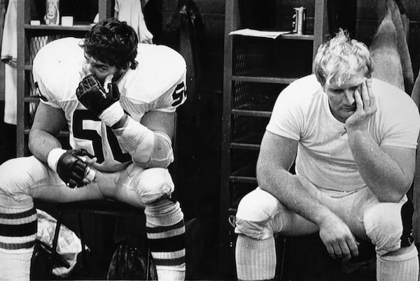 Dejected Ottawa Rough Riders - Kevin Powell, left, and Pat Staub - reflect on their 26-23 loss to the Edmonton Eskimos.The Canadian Press