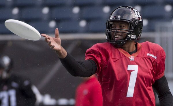 Ottawa Redblacks quarterback Henry Burris throws a frisbee during team practice before Sunday’s championship.Jonathan Hayward/The Canadian Press