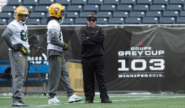 Ottawa Redblacks head coach Rick Campbell walks during practice in Winnipeg Nov. 25, 2015. His father, Edmonton Eskimo coach Hugh Campbell, holds the Grey Cup in Montreal on Nov. 22, 1981.The Canadian Press