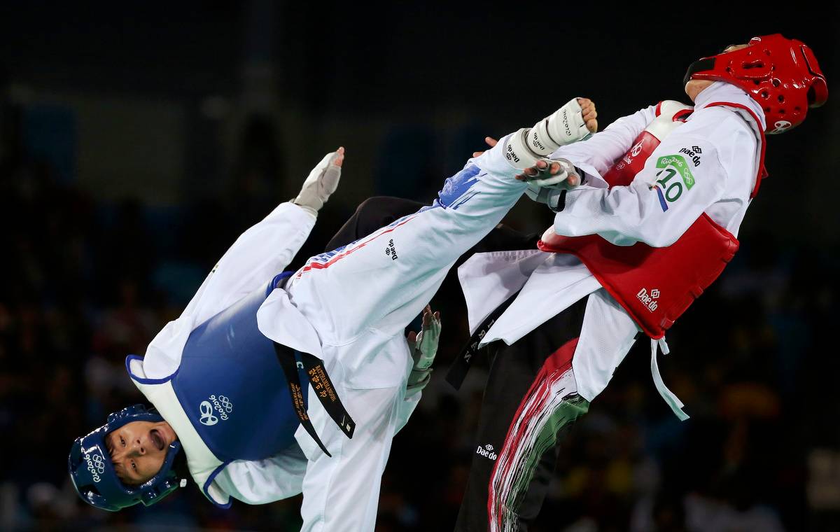 Phannapa Harnsujin of Thailand lands a kick against Kimia Alizadeh Zenoorin of Iran during their women's Taekwondo 57-kg match. (Issei Kato/Reuters)