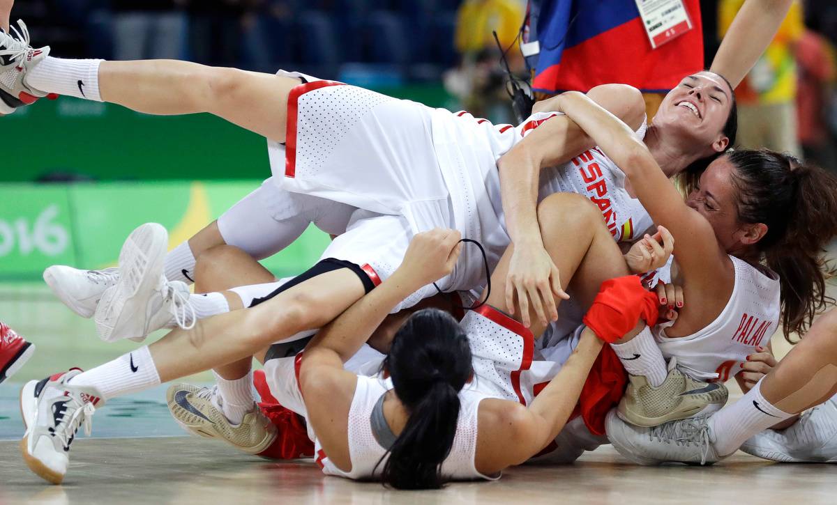 Members of the Spain basketball team celebrate their win over Serbia in a women's semifinal round basketball. (Eric Gay/AP Photo)