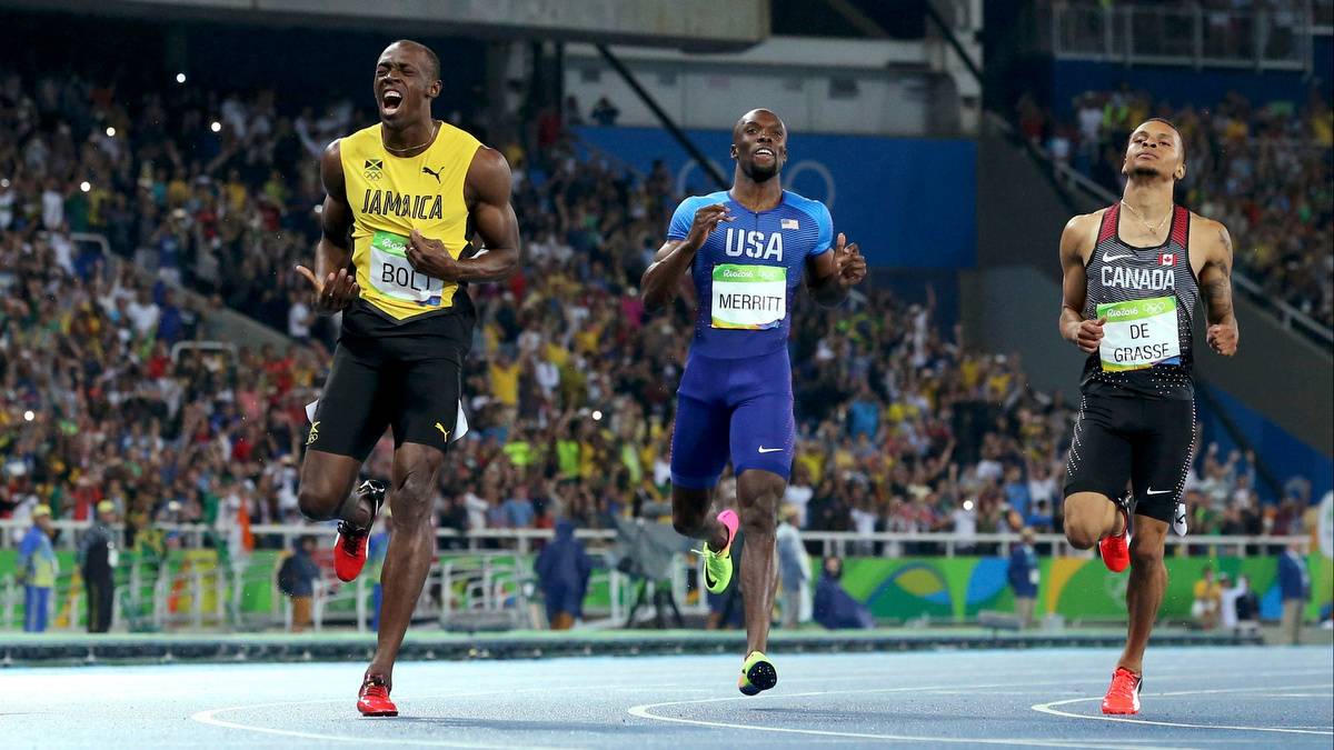 Usain Bolt of Jamaica reacts as he finishes ahead of LaShawn Merritt of USA and Andre De Grasse of Canada in the men's 200 metres finals. (Lucy Nicholson/Reuters)