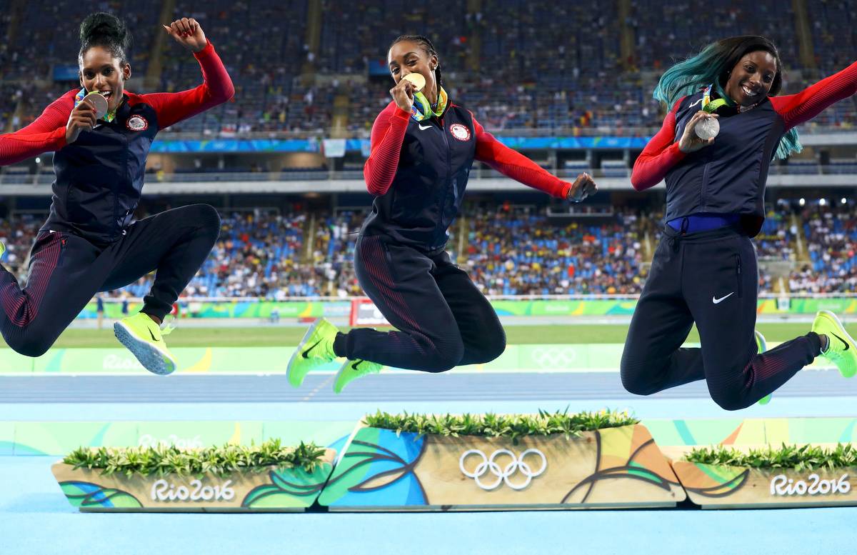 Gold medalist Brianna Rollins of USA, silver medalist Nia Ali of USA and bronze medalist Kristl Castlin of USA jump for a photo after their medal ceremony. (Leonhard Foeger/Reuters)