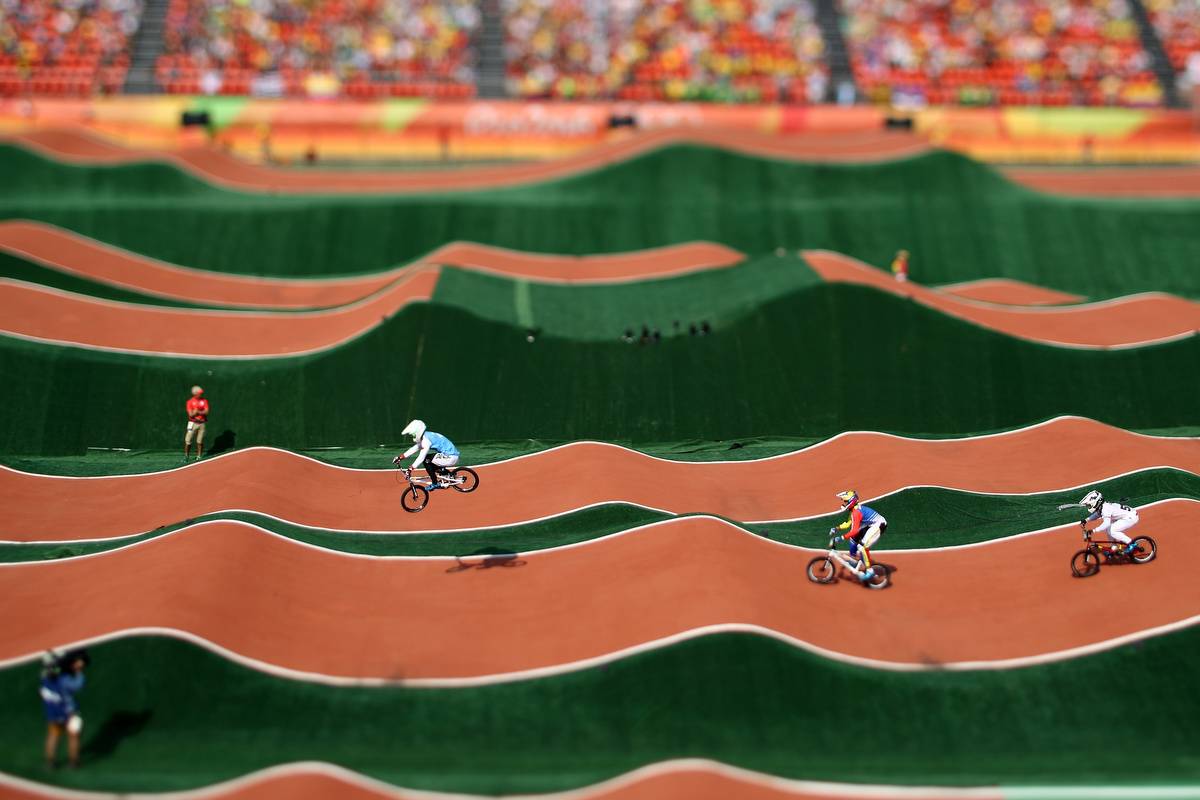 Tory Nyhaug of Canada leads the field in the cycling BMX men's quarterfinals. (Mark Kolbe/Getty Images)