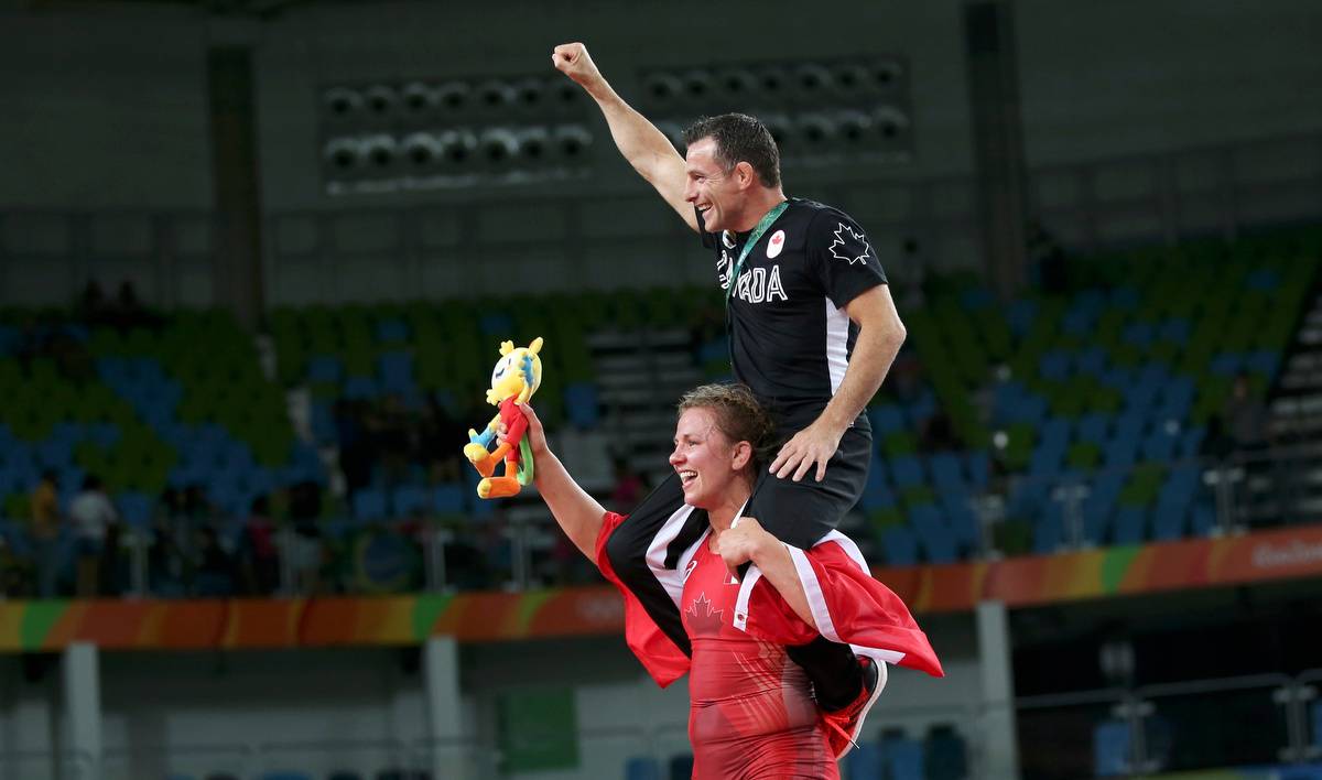 Erica Wiebe of Canada celebrates with her coach after winning the gold medal in women's 75kg freestyle wrestling. (Toru Hanai/Reuters)