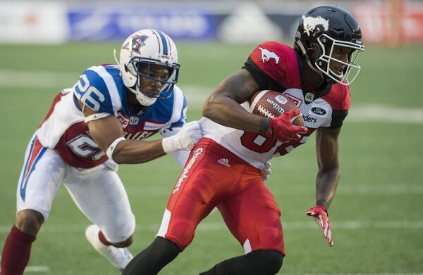 Montreal Alouettes' Tyree Hollins (26) tackles Calgary Stampeders' Kamar Jorden during first half CFL football action in Montreal, Friday, July 14, 2017.Graham Hughes/The Canadian Press