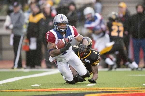 Montreal Alouettes’ Arland Bruce is brought down by Hamilton Tiger-Cats defensive back Evan McCollough during first half East Division semifinal CFL action in Guelph, Ont., on Sunday, Nov. 10, 2013.Frank Gunn/The Canadian Press