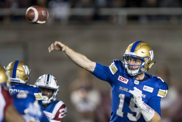 Winnipeg Blue Bombers quarterback Matt Nichols fires a pass as they face the Montreal Alouettes on Aug. 24, 2017.Paul Chiasson/The Canadian Press