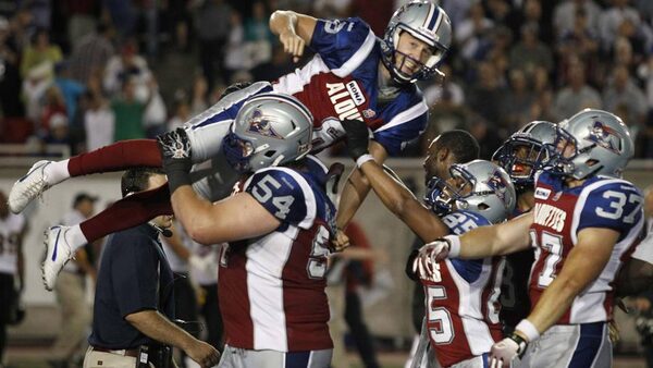 Montreal Alouettes' Sean Whyte (top C) is lifted by teammates after his winning field goal during the second half of their CFL football game against the Hamilton Tiger-Cats in Montreal August 23, 2012.Reuters