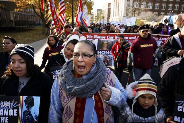 The event began with a march through the University of Minnesota campus to TCF Bank Stadium, where Native American leaders, local politicians, former sports stars and other speakers voiced their disdain for Redskins owner Dan Snyder and his refusal to change the nickname they've derided as derogatory and racist.