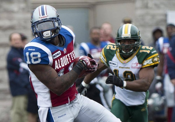 Montreal Alouettes' Jamel Richardson breaks away from and Edmonton Eskimos' T.J. Hill during first half CFL action in Montreal, Sunday, October 28, 2012.Graham Hughes/The Canadian Press