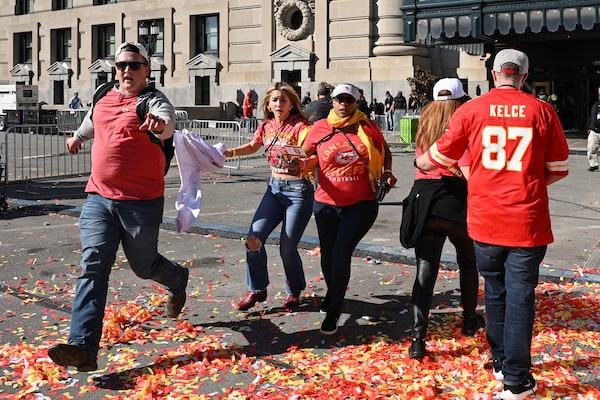 People flee after shots were fired near the Kansas City Chiefs' Super Bowl LVIII victory parade on Feb.14 in Kansas City, Missouri.ANDREW CABALLERO-REYNOLDS/Getty Images