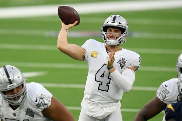 Derek Carr of the Las Vegas Raiders throws a fourth quarter pass against the Los Angeles Chargers at SoFi Stadium on Nov. 08, 2020 in Inglewood, California.Harry how/Getty Images