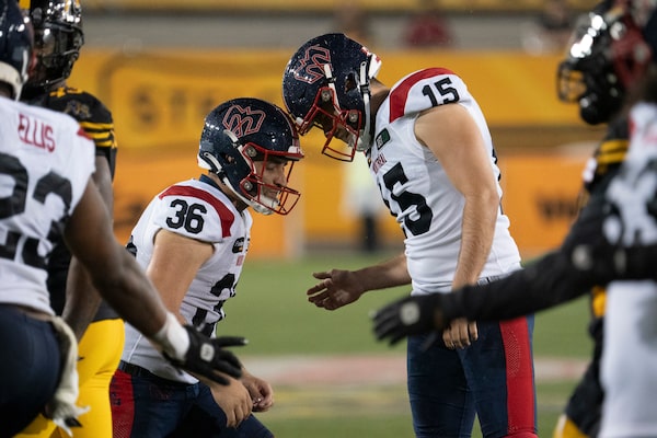 Montreal Alouettes kicker David Cote (15) and punter Joseph Zema (36) bump helmets after a field goal during a game against the Hamilton Tiger Cats, in Hamilton, Ont., on June 23.Peter Power/The Canadian Press